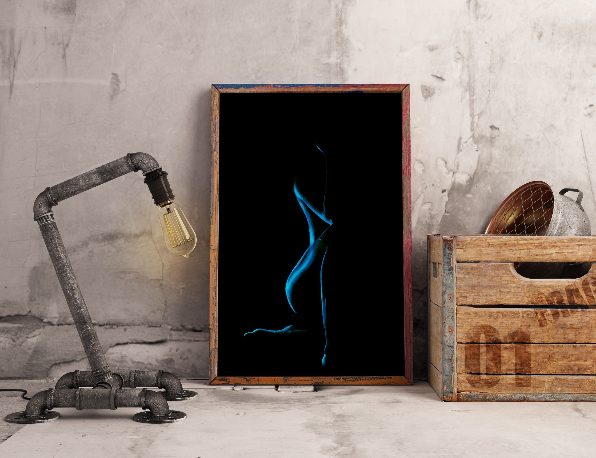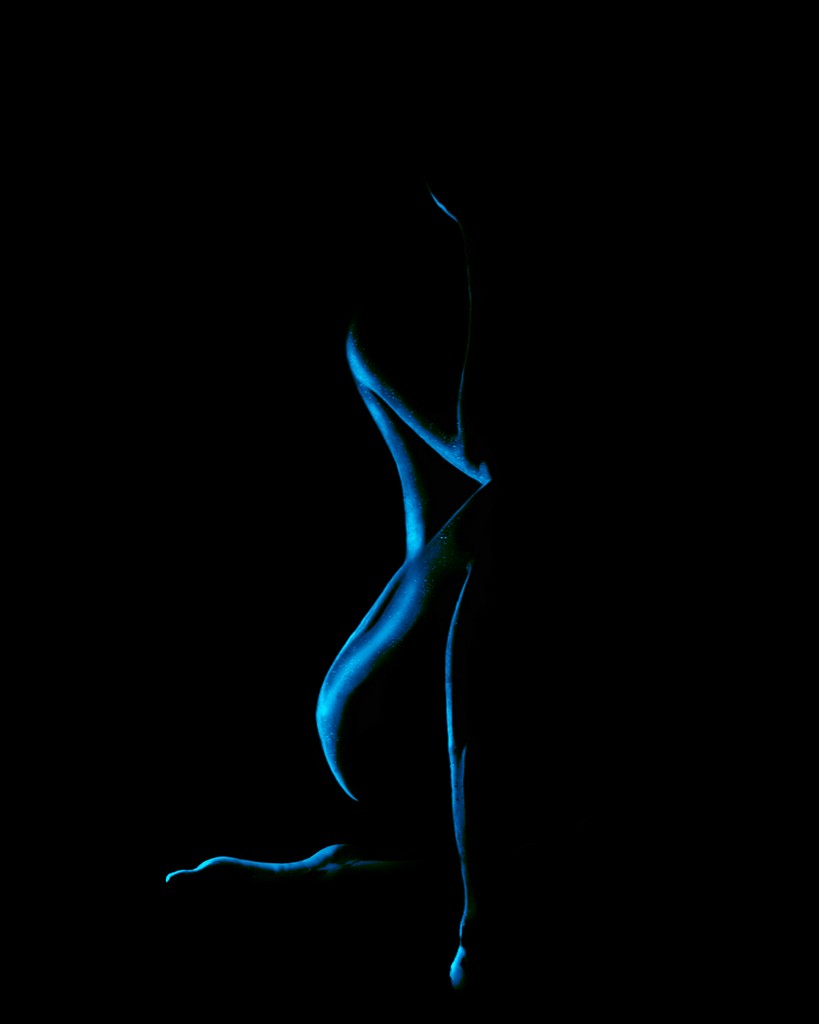 From the darkness, a single, silent form is revealed by a flash of blue light.