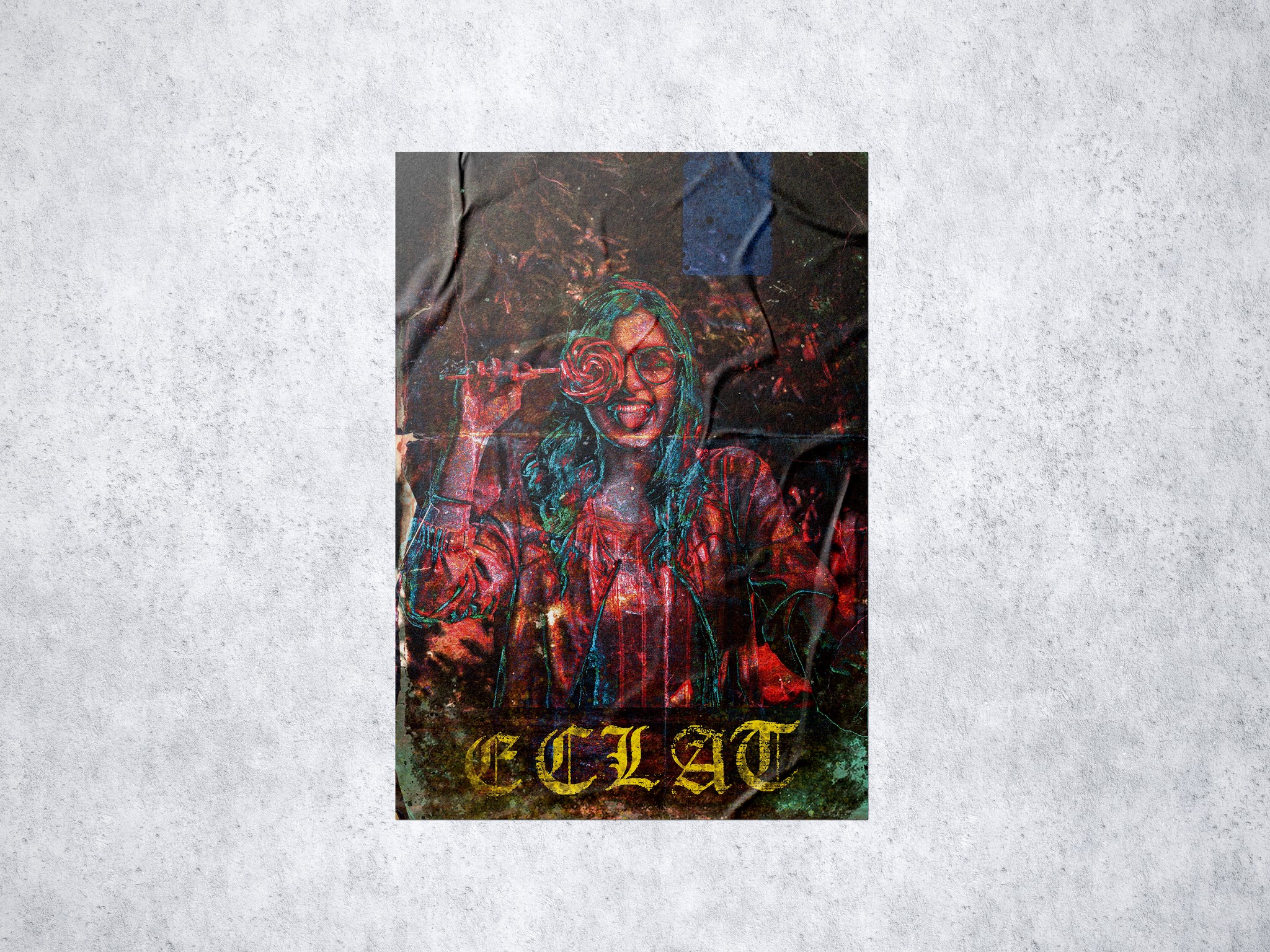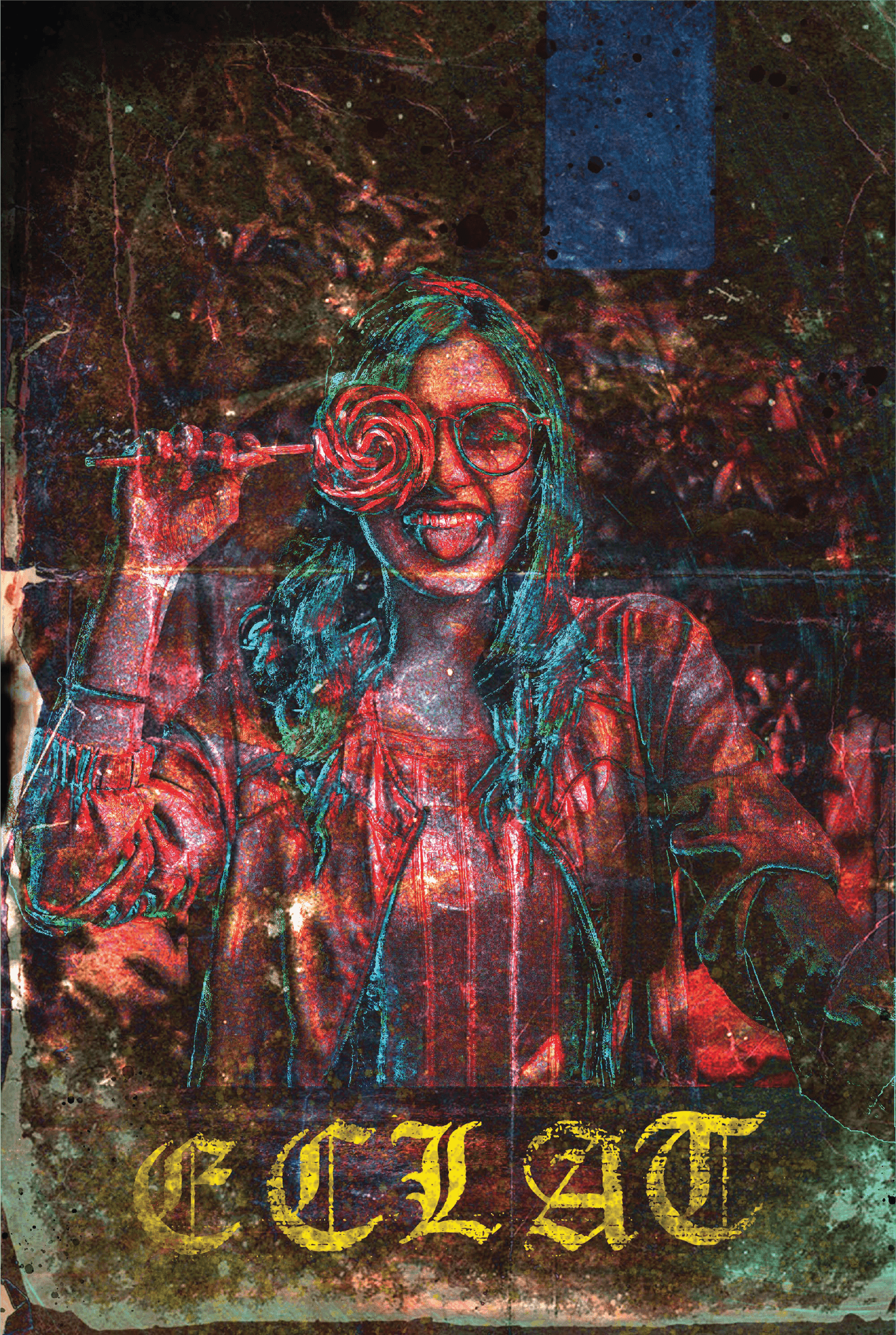Beyond the faded texture, a flash of light reveals the contrast between innocence and the chaotic world.