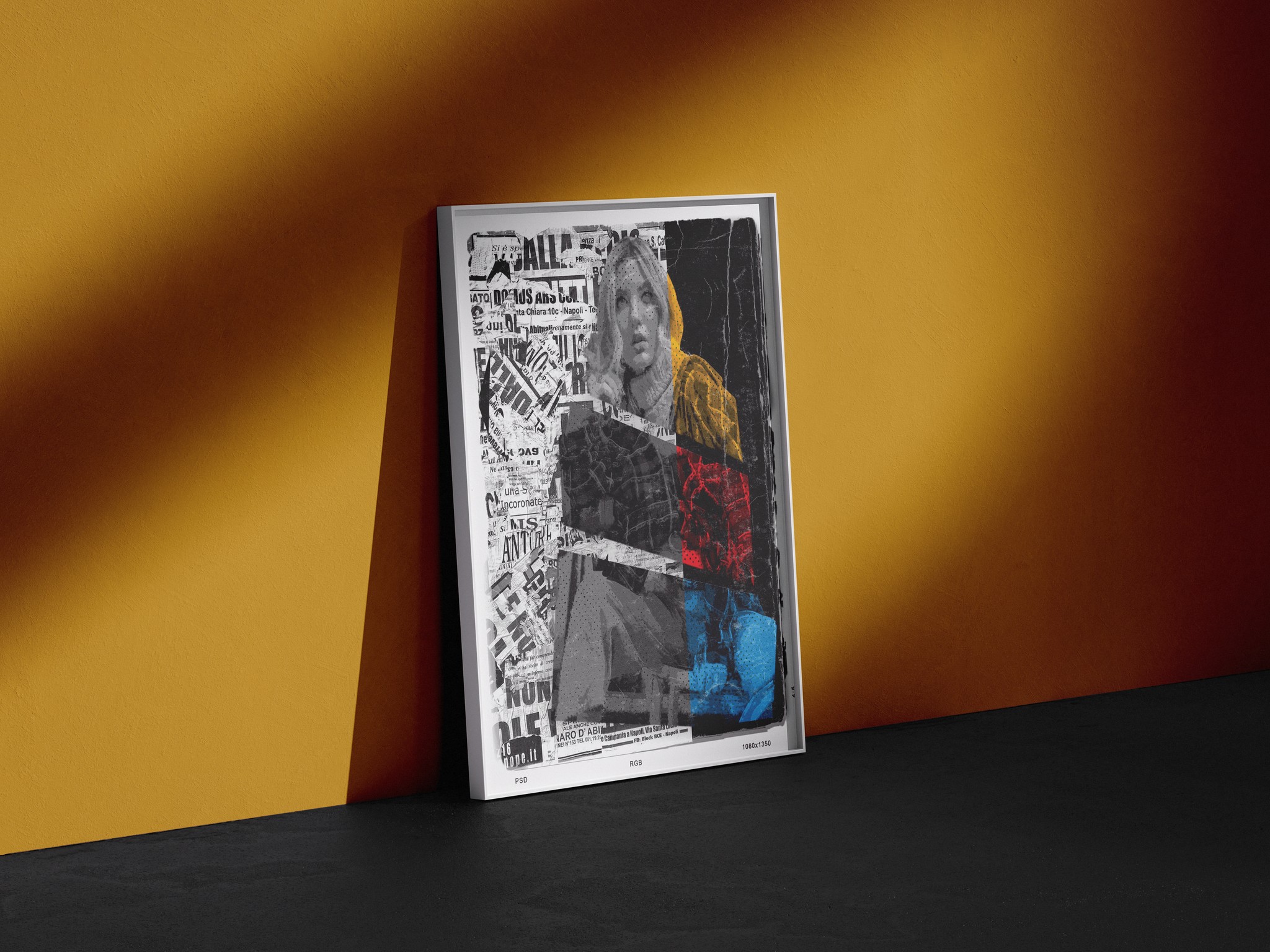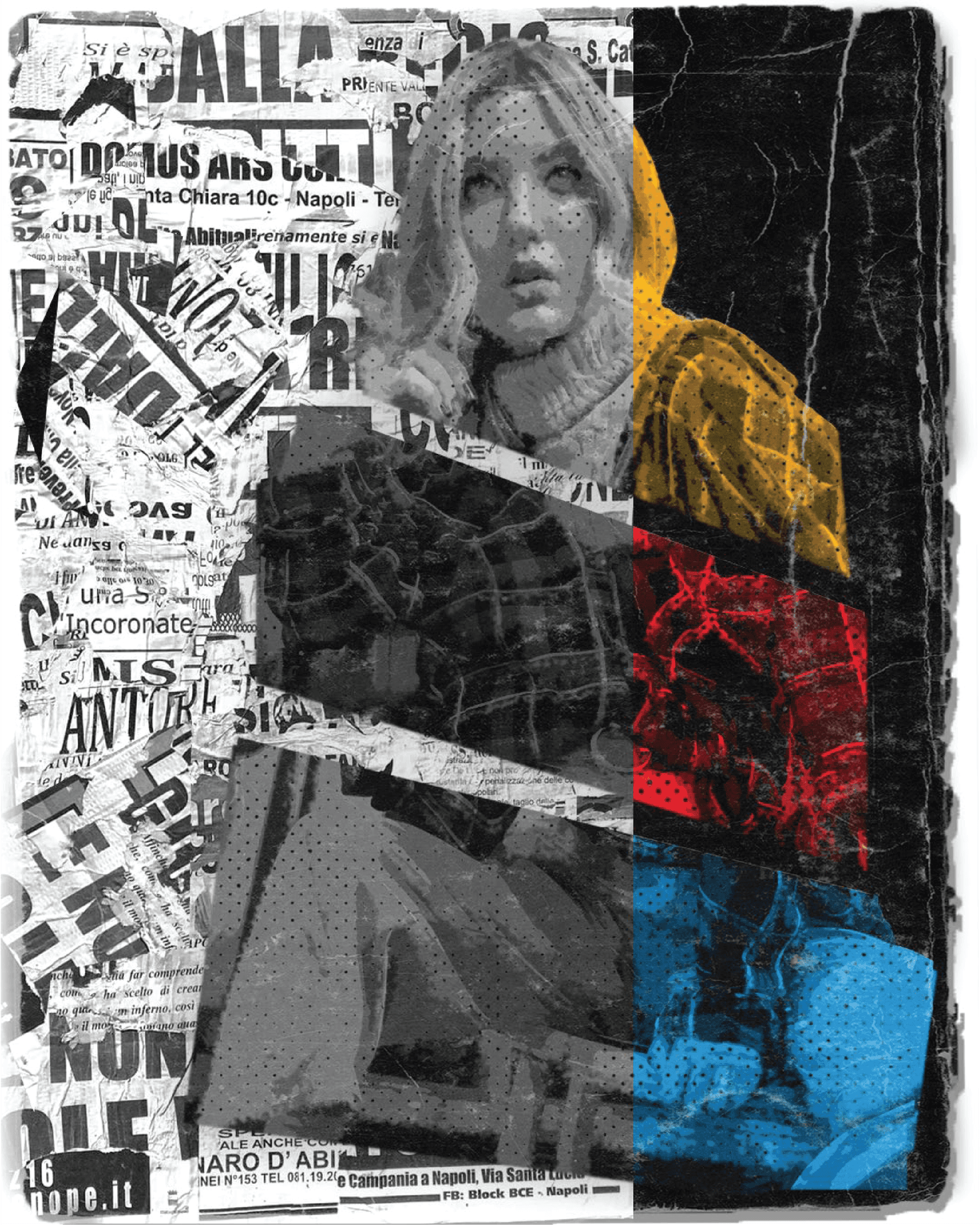 A portrait of fragmented reality, where a face emerges from the urban chaos of information and noise.
